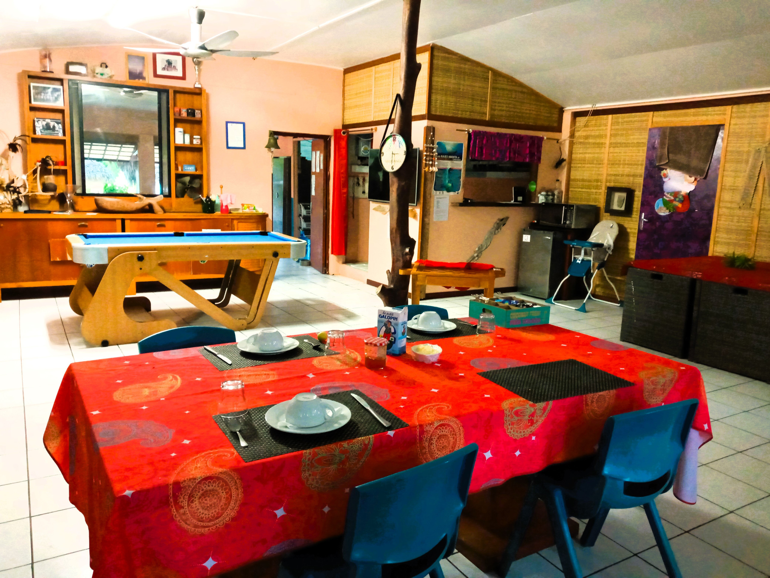 O café da manhã continental e o jantar com sabores exóticos são oferecidos a todos os residentes. Seu anfitrião, reconhecido por sua deliciosa culinária e acolhimento caloroso, garantirá que você seja bem servido e se sinta à vontade. Uma raridade em Tuamotu, a sala comum também abriga um bilhar para momentos de entretenimento. A conexão de internet Wi-Fi é disponibilizada gratuitamente, permitindo que você permaneça conectado e compartilhe suas aventuras.