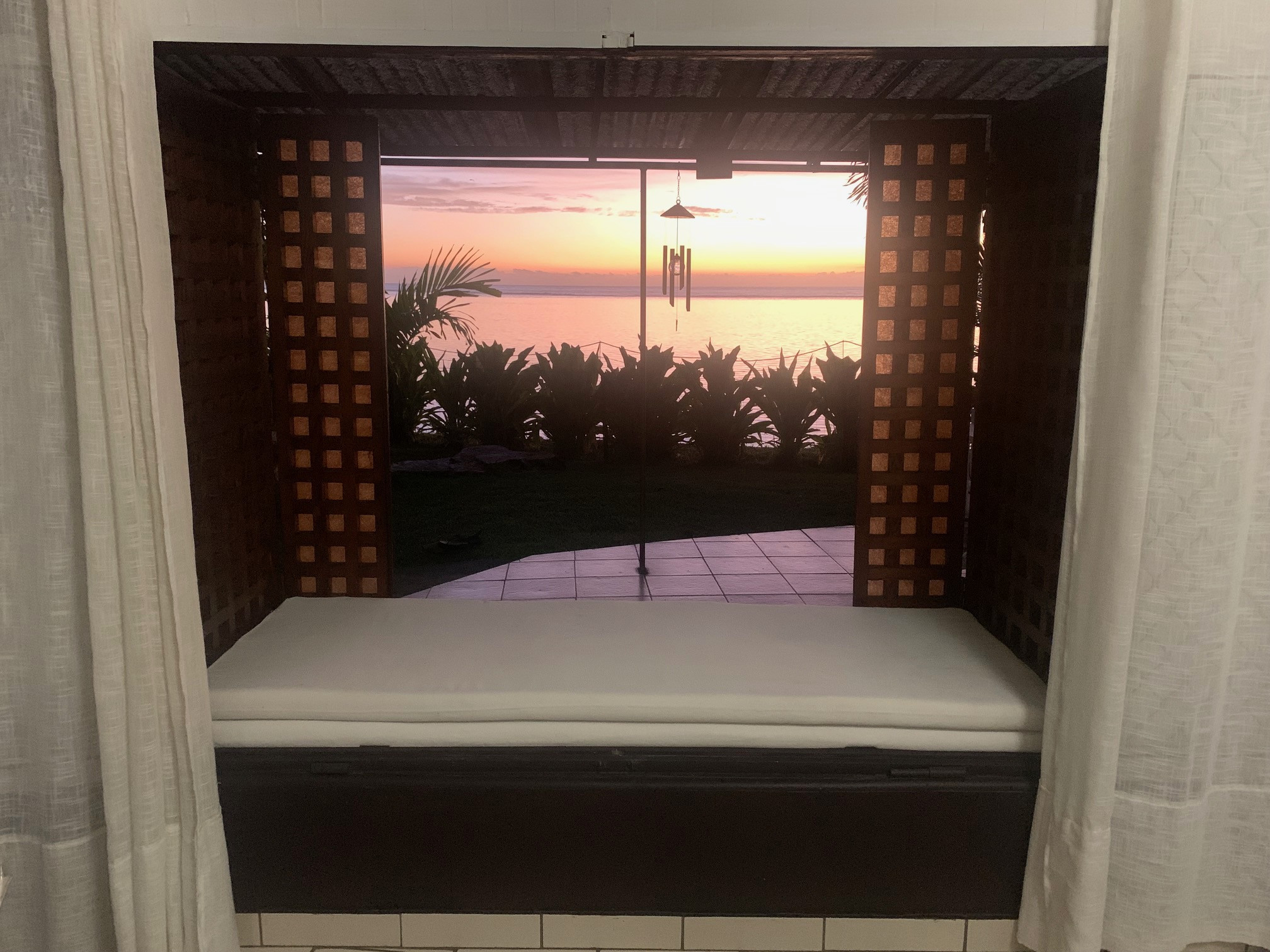 Vom Wohnzimmer aus gelangen Sie auf die überdachte Hauptterrasse. In dieser Oase der Ruhe können Sie den privaten Garten und den atemberaubenden Blick auf den Strand, die Lagune und die Insel Moorea genießen. Es ist der perfekte Ort, um Ihre Mahlzeiten im Schatten einzunehmen oder einen Aperitif zu genießen und dabei den Sonnenuntergang zu bewundern.