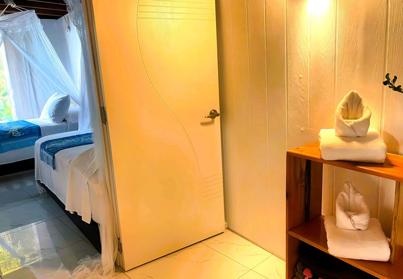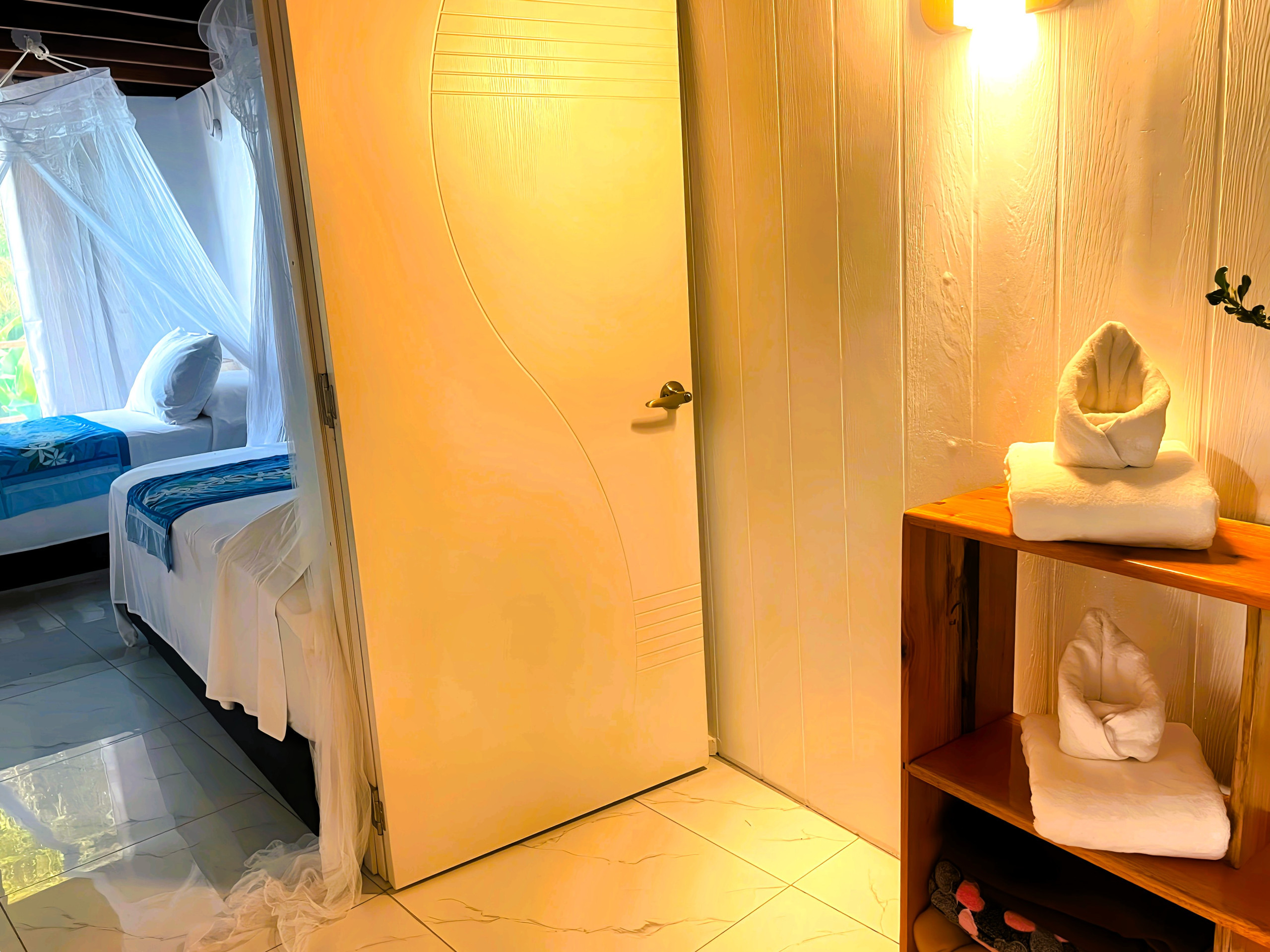 Located in the heart of a lush estate of over 2 hectares with a total of 6 accommodations, this recent 48 m² fare combines modern comfort and tropical charm. Designed to accommodate up to 5 people, it offers an air-conditioned master bedroom equipped with a canopy bed with an integrated mosquito net for peaceful nights. The second bedroom is also air-conditioned and consists of 3 single beds, each with its own mosquito net.