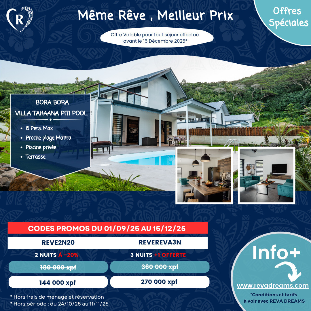 Enjoy exceptional discounts on your stay in Bora Bora for any booking made until December 15, 2025, excluding school holidays and public holidays.