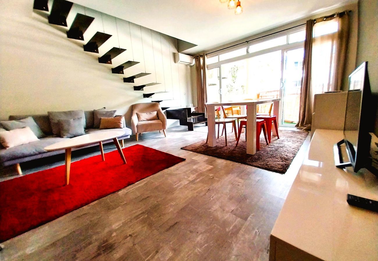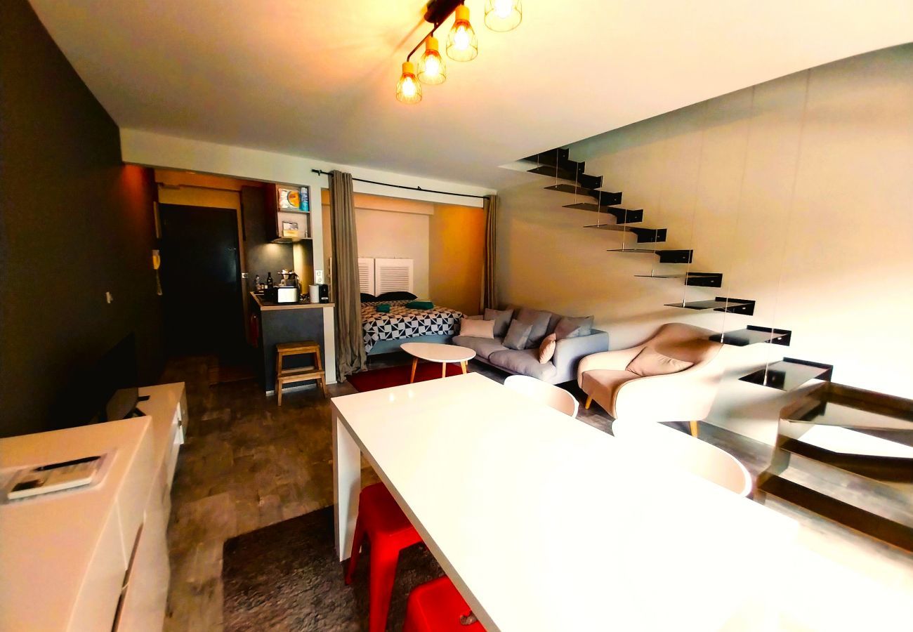 El salón es espacioso, con una distribución moderna, elegante y despejada. Dispone de una sala de estar con televisión, sofá y sillón, y de una zona de comedor con mesa y sillas, que ofrecen todo lo necesario para los momentos de convivencia. Una espléndida escalera suspendida de hierro forjado añade un toque especial de encanto a este alojamiento. El balcón, equipado con un salón de ratán, será apreciado para disfrutar de su café matinal, de sus aperitivos al final del día o incluso de sus comidas al aire libre.