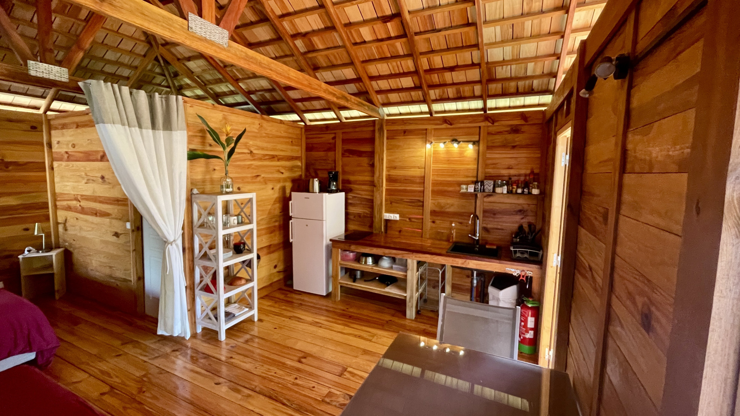 El bungalow está equipado con una cocina, permitiéndole preparar sus comidas a su gusto. También encontrará un cuarto de baño privado con ducha, WC y lavabo, garantizando todo el confort necesario para su estancia.