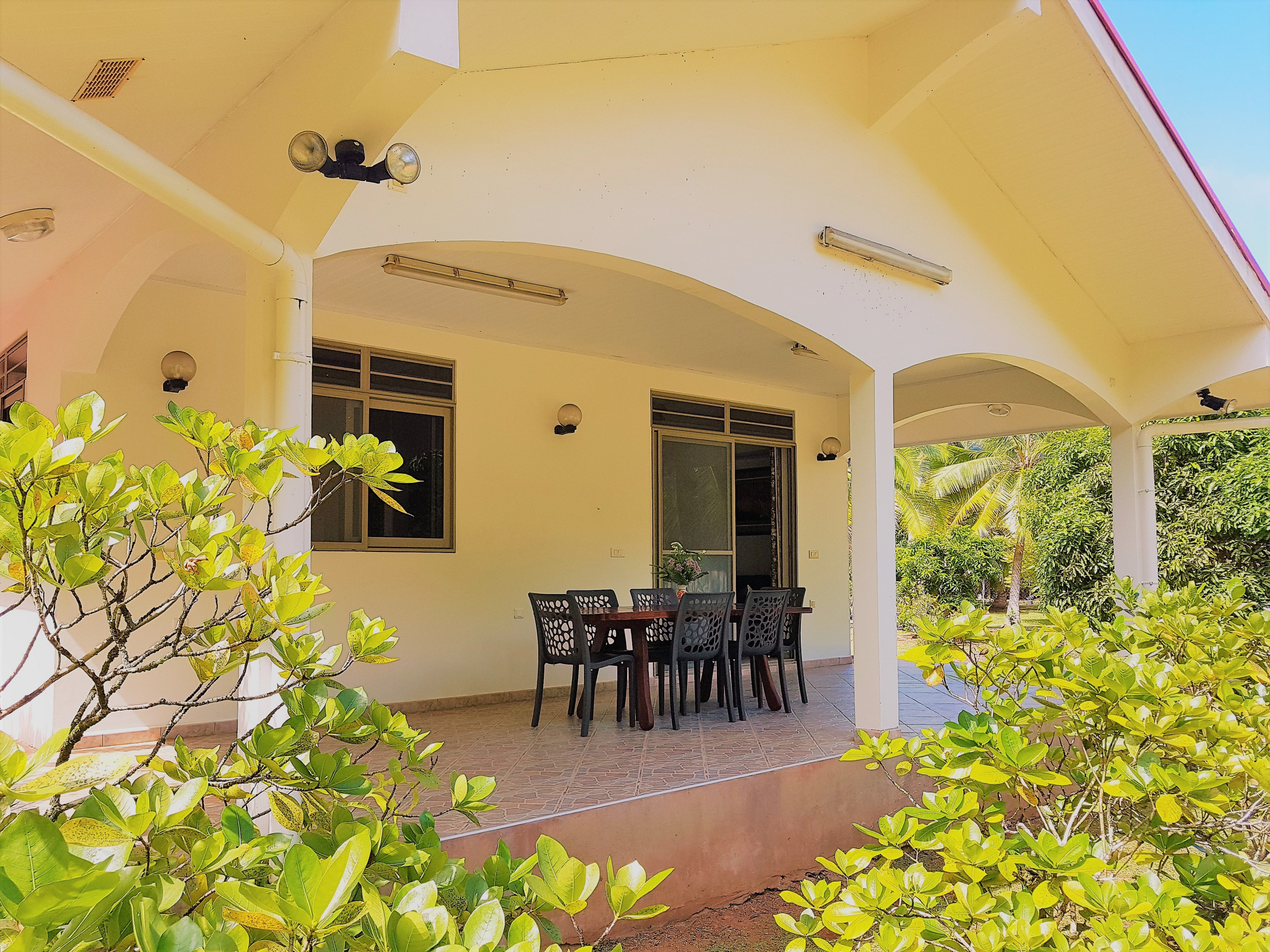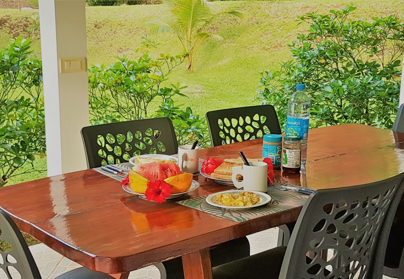 Su lugar favorito será la terraza donde podrá relajarse, tomar sus comidas y preparar sus barbacoas... La villa también cuenta con un jardín muy grande arbolado que ofrece un terreno de juego ideal para los niños. Al fondo de la propiedad hay un río de Maroe, un lugar cargado de "Mana" y una plantación de noni.