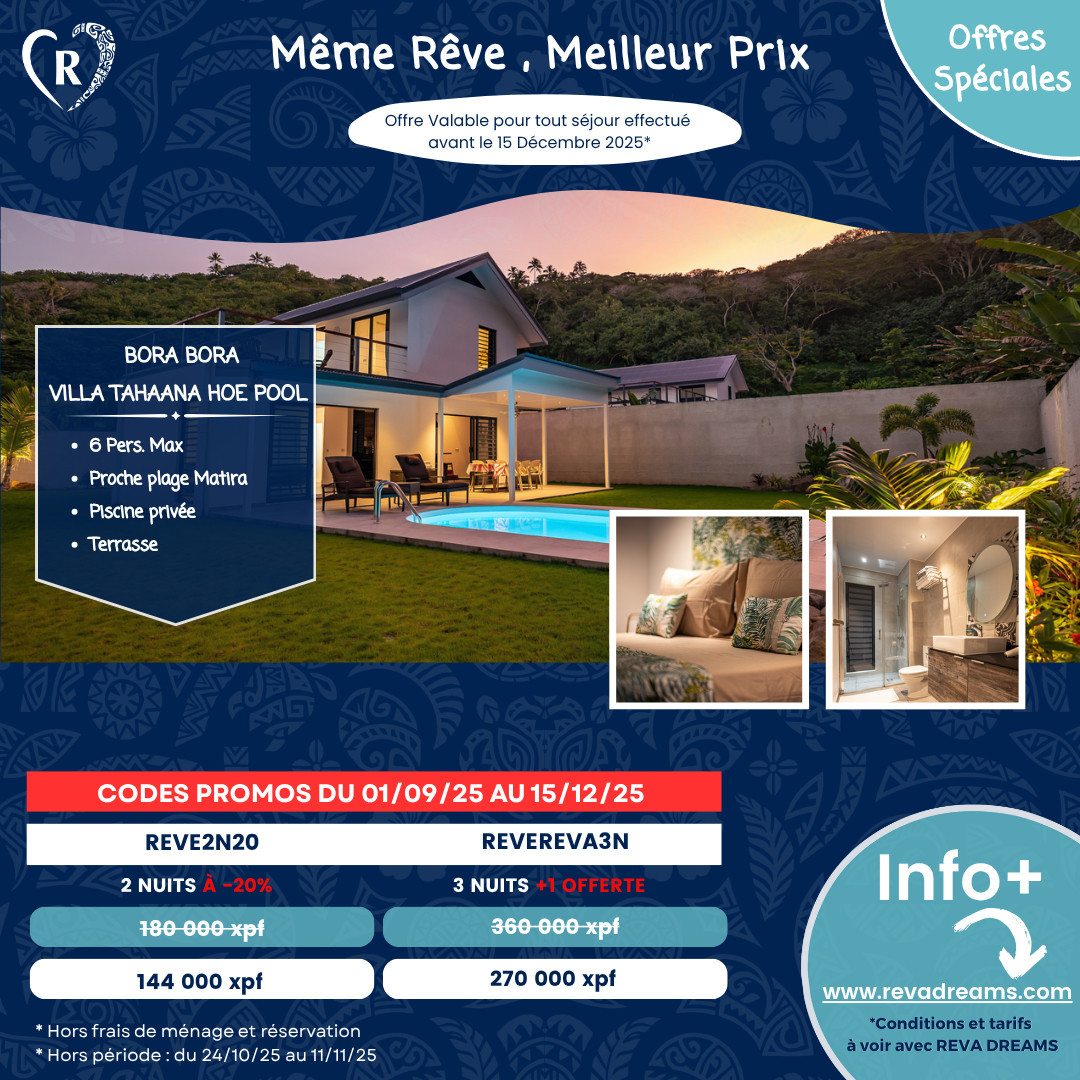 Aprovecha descuentos excepcionales en tu estancia en Bora Bora para cualquier reserva realizada hasta el 15 de diciembre de 2025, excluyendo vacaciones escolares y días festivos.