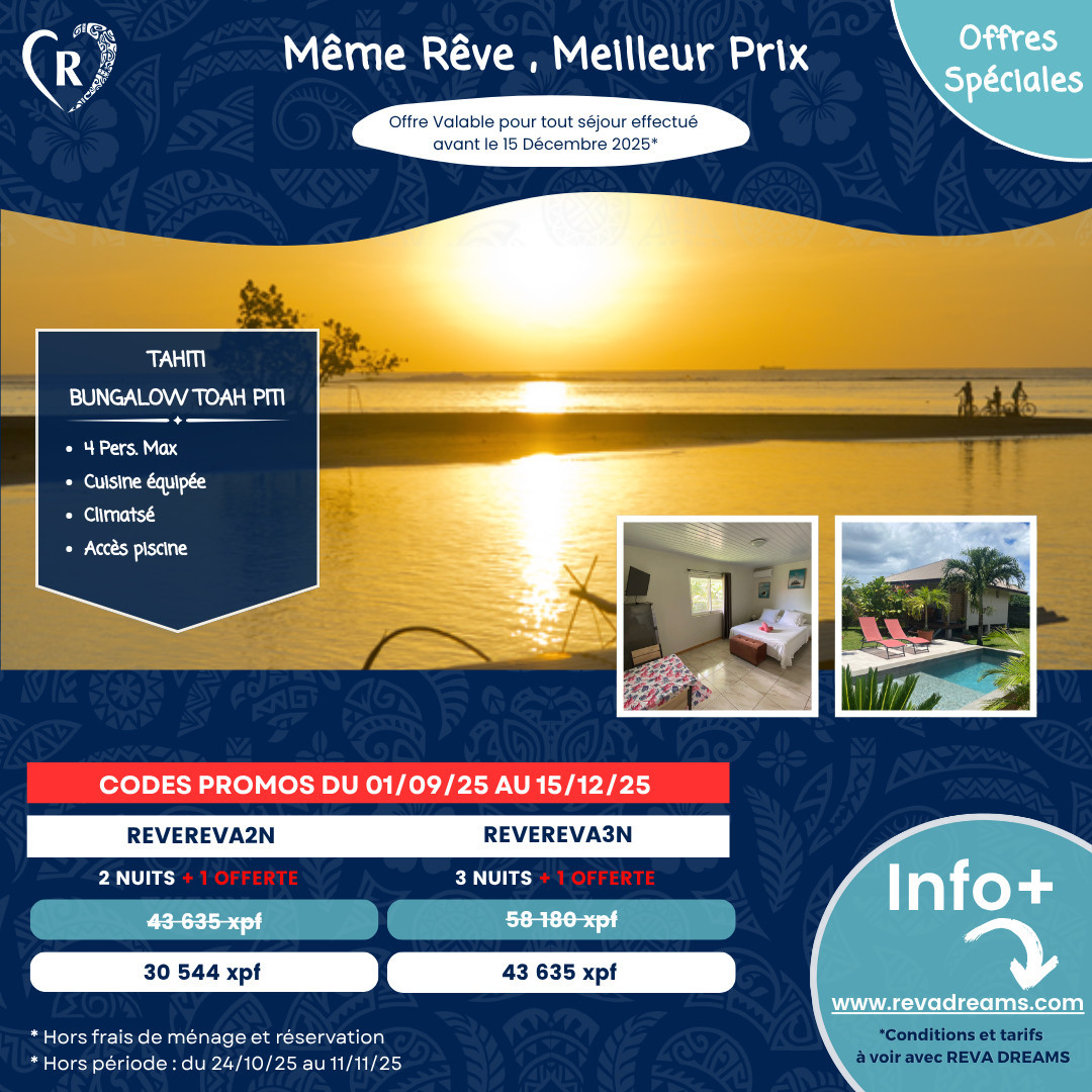 Disfruta de descuentos excepcionales en tu estancia en Tahití para reservas realizadas hasta el 15 de diciembre de 2025, excluyendo vacaciones escolares y festivos.