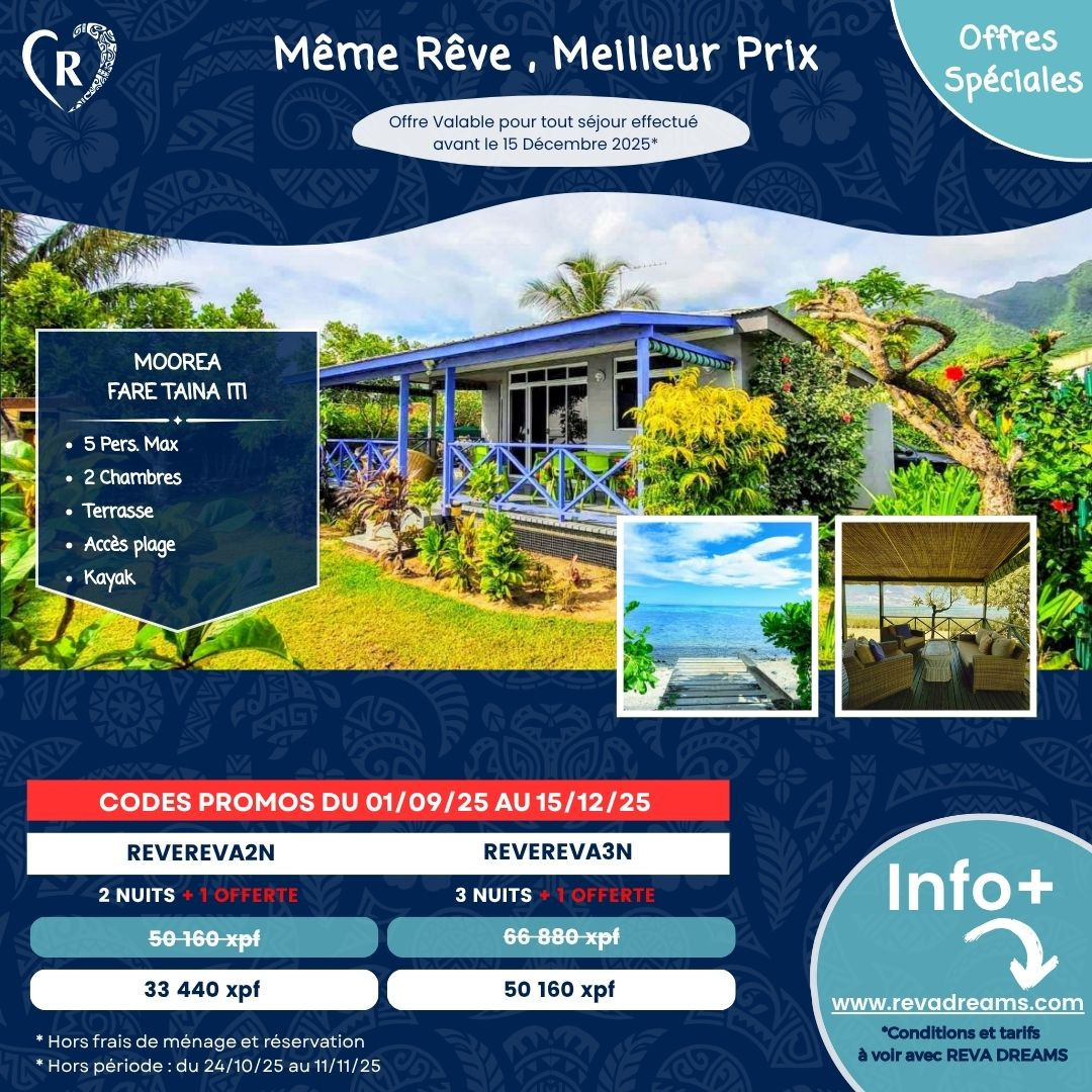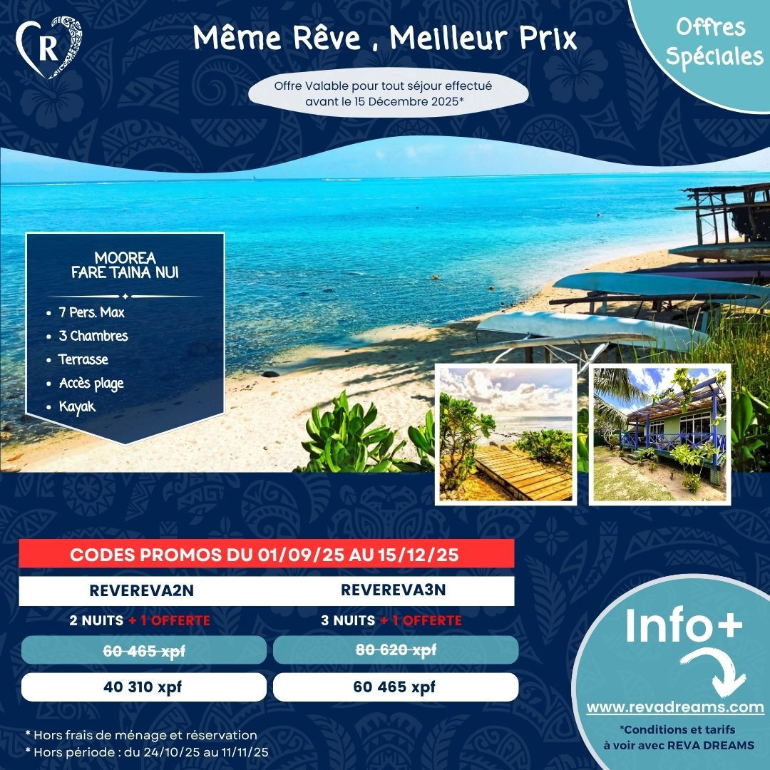Approfitta di sconti eccezionali sul tuo soggiorno a Moorea per prenotazioni effettuate fino al 15 dicembre 2025, escluse vacanze scolastiche e giorni festivi. Contatta il nostro servizio prenotazioni via email: revadreams@revagroupe.com
