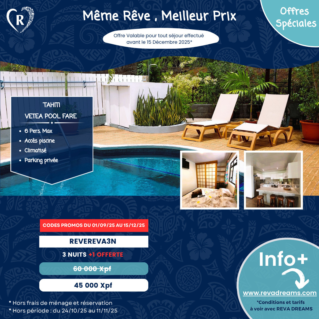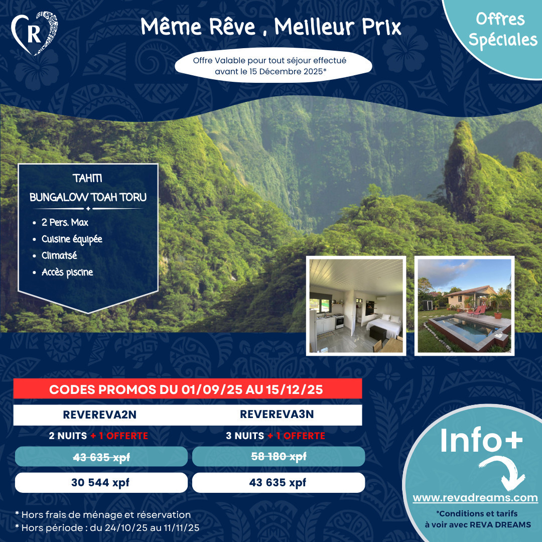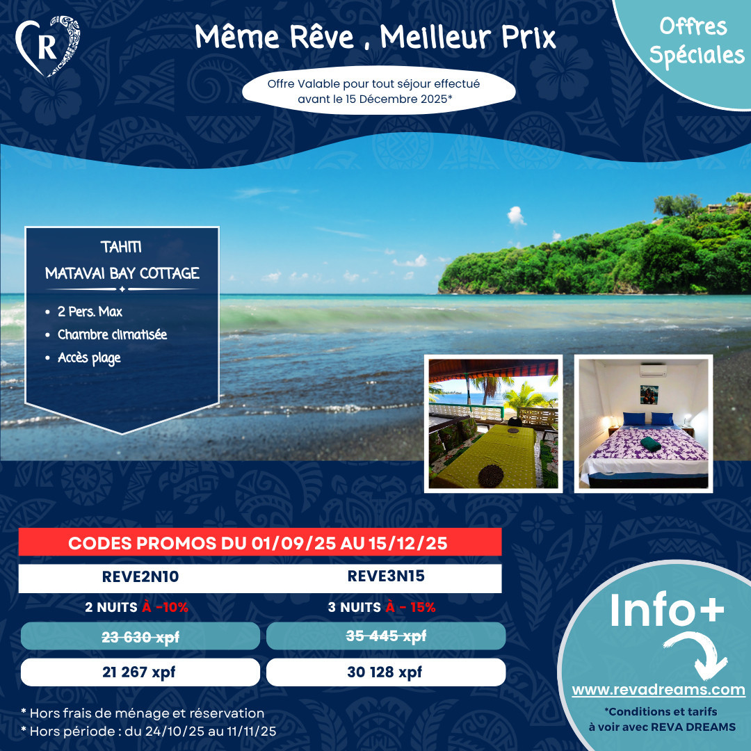 Approfitta di sconti eccezionali sul tuo soggiorno a Tahiti per prenotazioni effettuate fino al 15 dicembre 2025, escluse vacanze scolastiche e giorni festivi.