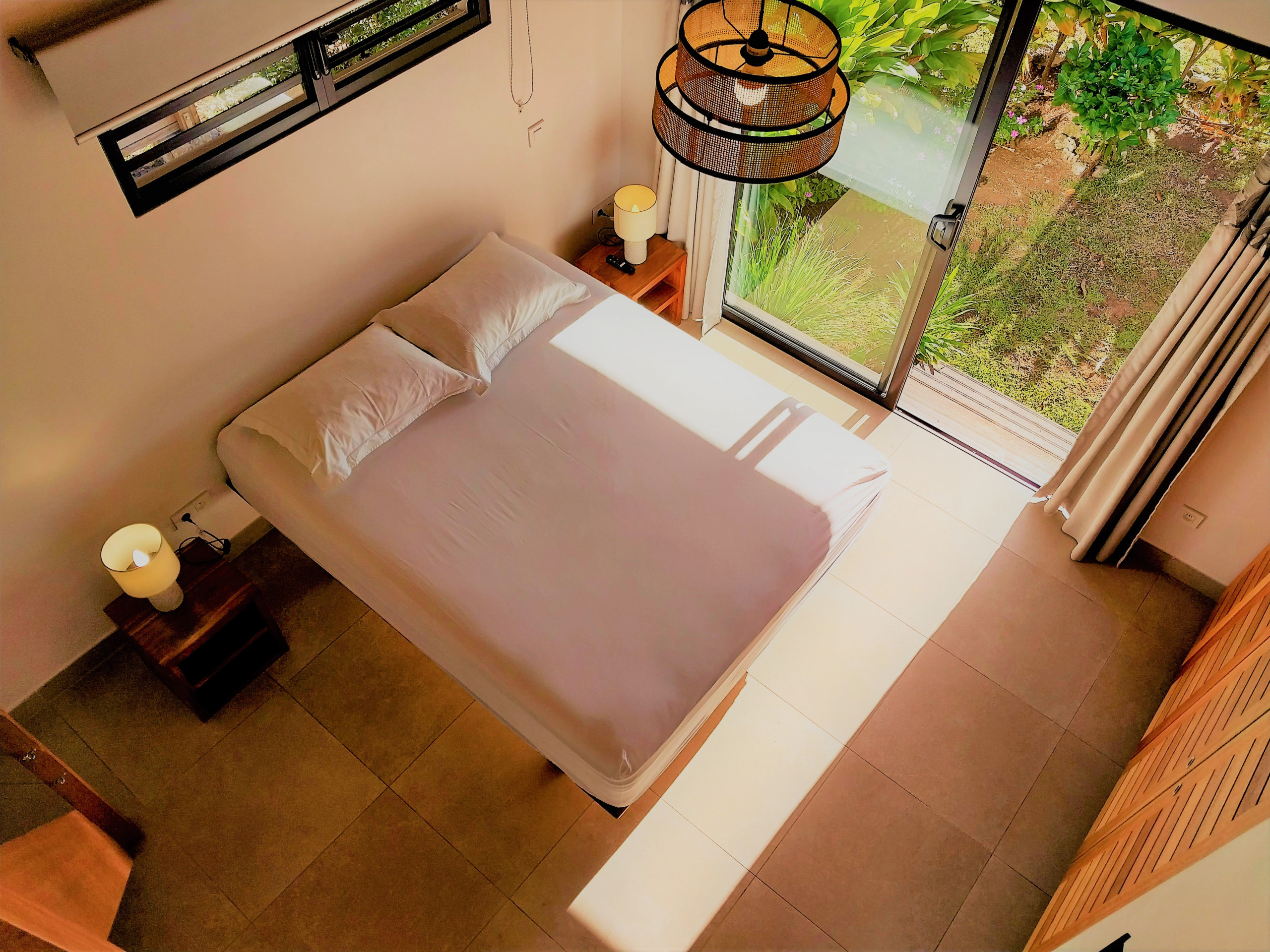 Le tre camere sono ciascuna dotata di un letto Queen size, promettendovi notti serene. Ogni camera dispone di un proprio bagno privato con doccia e un accesso diretto all'esterno, per godere della natura lussureggiante che circonda la proprietà e della brezza marina rinfrescante. Le mezzanine con due letti singoli aggiungono un tocco giocoso all'alloggio, ideali per famiglie o gruppi di amici.