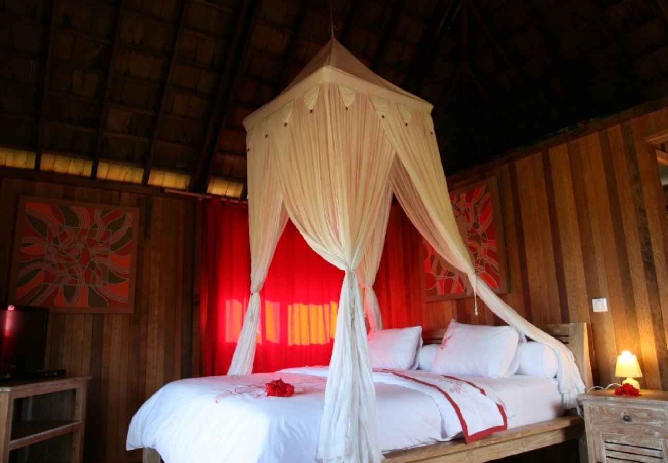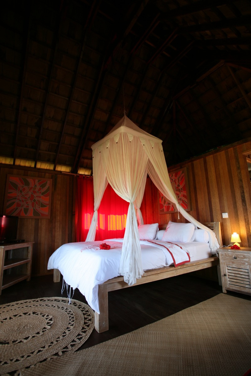 Imaginez-vous dans un bungalow offrant une vue magnifique sur la nature, baignée par la douce lumière du soleil filtrant à travers les feuilles des arbres environnants. Vous y trouverez tout le confort nécessaire pour vous détendre et vous reposer après une journée bien remplie à explorer les merveilles de l'île. La chambre est équipée d'un lit king size et d'un lit simple, de moustiquaires de ciel, et d'une salle de bain privée avec douche et eau chaude, lavabo et WC, garantissant votre intimité et votre bien-être.