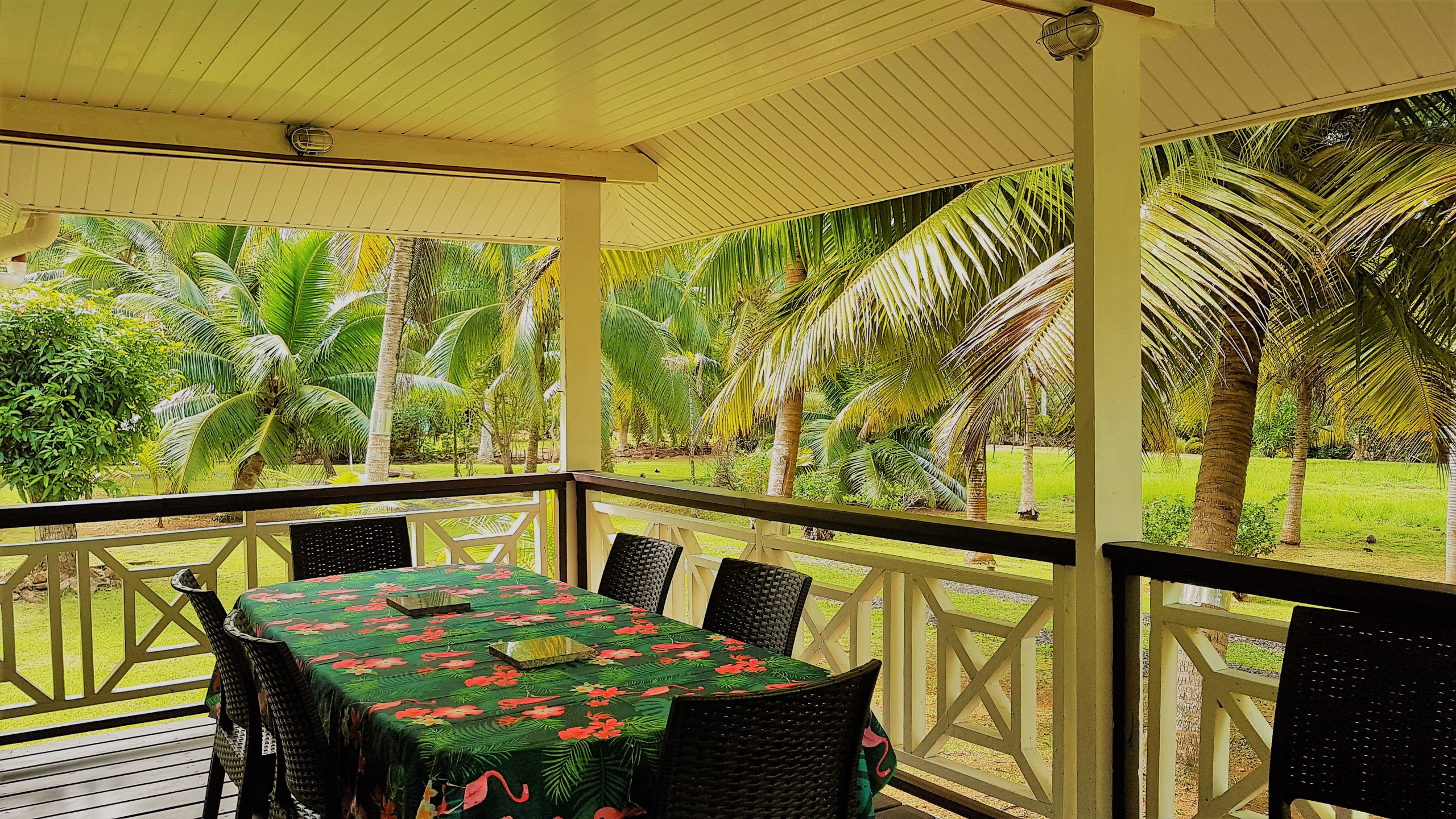 L'atout majeur de Hibiscus House réside dans sa grande terrasse en bois surplombant la superbe cocoteraie s'ouvrant sur la baie scintillante de Maroe. Équipée d'une table et de chaises, cette terrasse vous invite à savourer vos repas en plein air tout en admirant le panorama à couper le souffle. C'est également l'endroit idéal pour siroter un apéritif en fin de journeé, vous détendre à l'ombre aux heures les plus ensoleillée, plongé dans une atmosphère de sérénité absolue. Vous pourrez également vous adonner à la lecture, à la méditation, au yoga ou simplement vous imprégner de la beauté naturelle qui vous entoure.