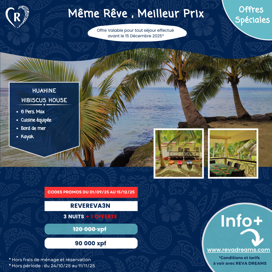 Profitez de remises exceptionnelles sur votre séjour à Huahine pour toute réservation effectuée jusqu’au 15 décembre 2025, hors vacances scolaires et jours fériés. Contactez notre service réservation par email revadreams@revagroupe.com