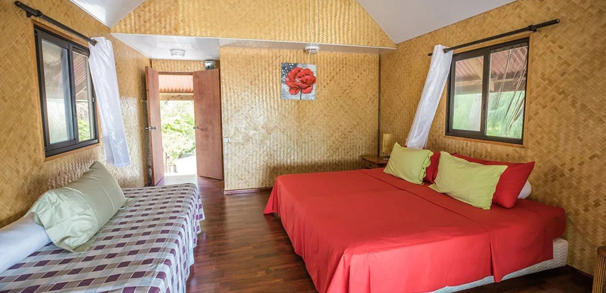 Este bungalow à beira da lagoa pode acolher até 4 pessoas com a sua grande cama de casal e beliches. Perfeito para famílias ou pequenos grupos. Desfrute do conforto de uma casa de banho privativa equipada com chuveiro, WC e água quente solar, num espírito simples, ecológico e prático.