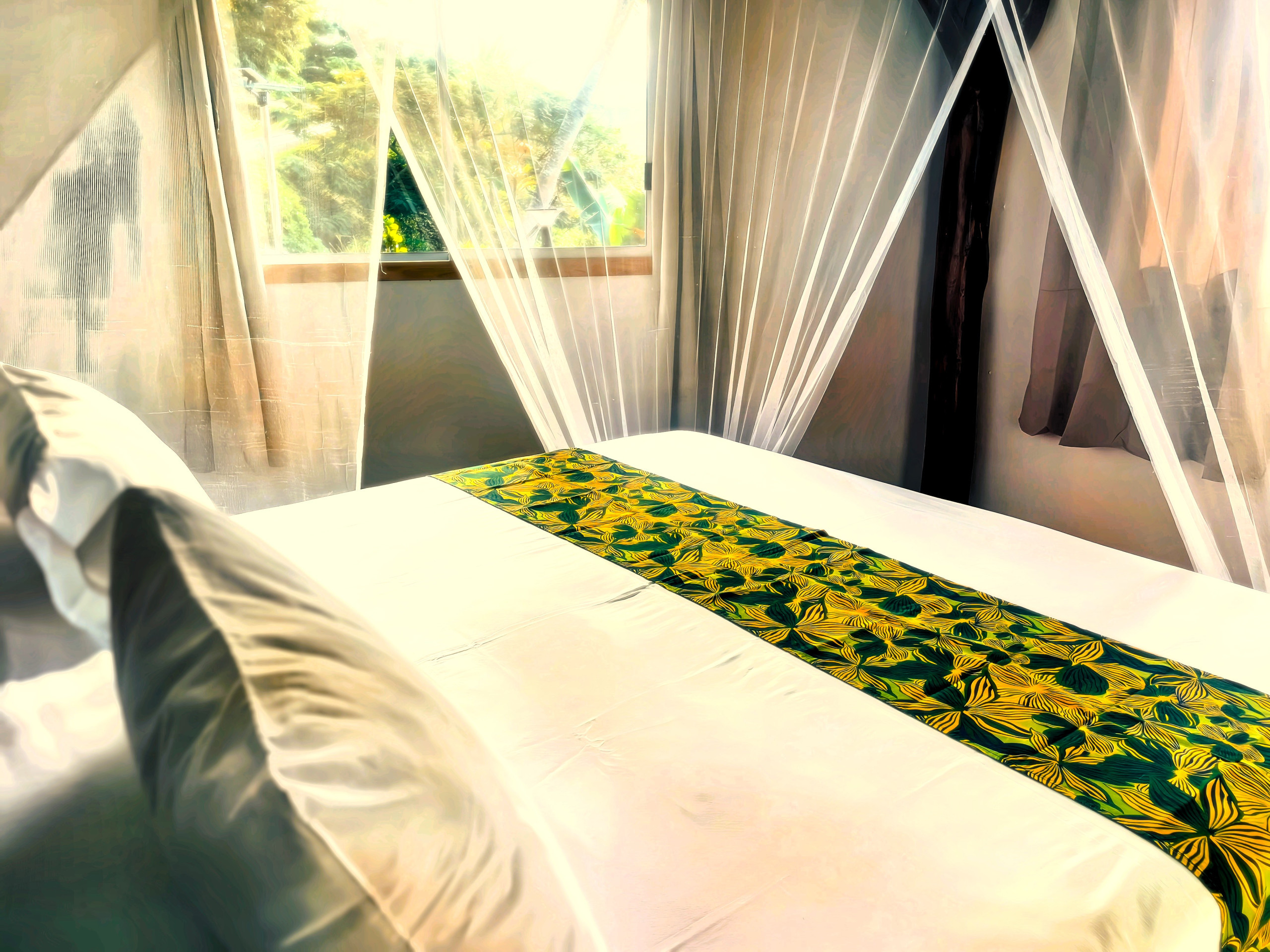 Located in the heart of a lush estate of over 2 hectares with a total of 6 accommodations, this recent 60 m² fare combines modern comfort and tropical charm. Designed to accommodate up to 5 people, it offers an air-conditioned master bedroom equipped with a canopy bed with an integrated mosquito net for peaceful nights. The second bedroom is also air-conditioned and consists of 2 single beds, each with its own mosquito net. In the living room, a sofa bed will be prepared for the 5th occupant.