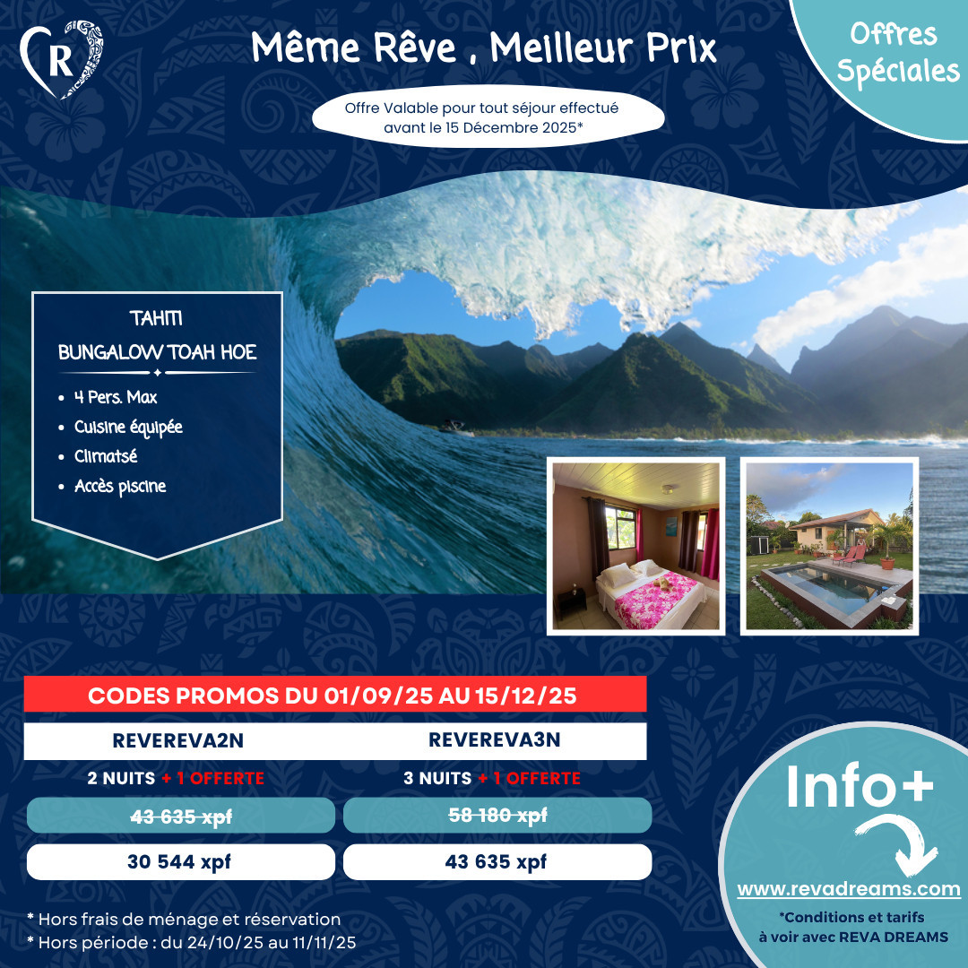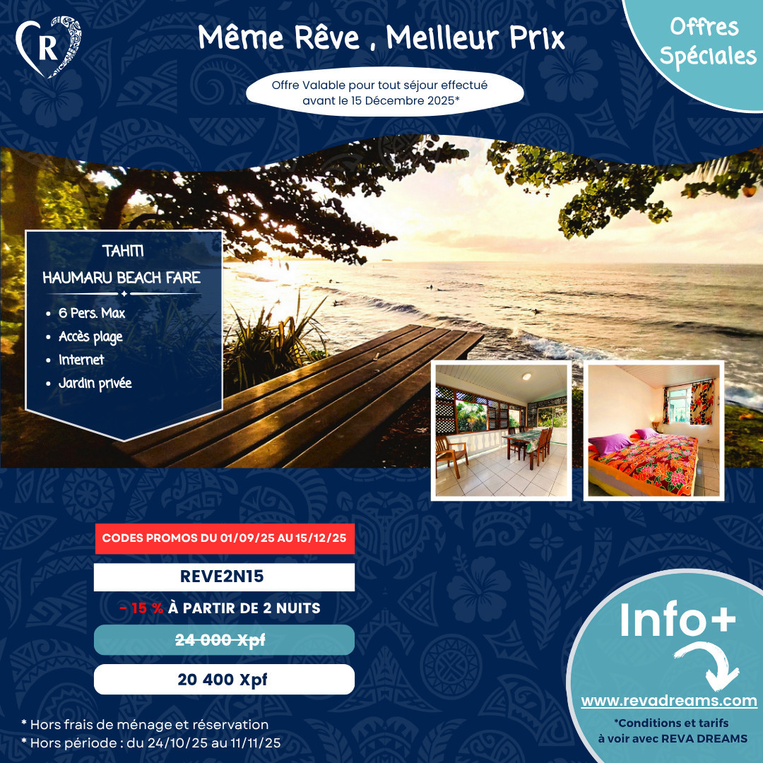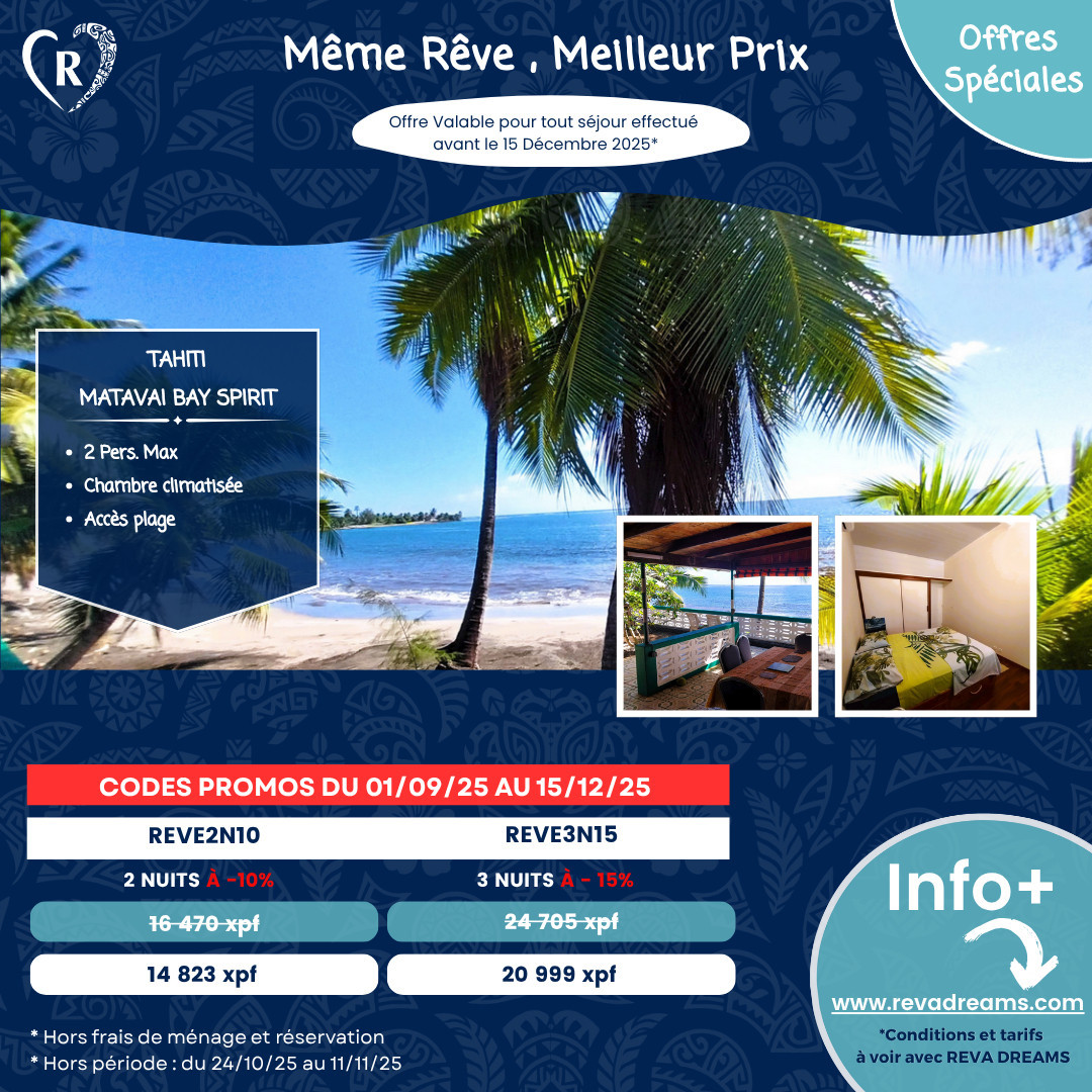 Enjoy exceptional discounts on your stay in Tahiti for any booking made until December 15, 2025, excluding school holidays and public holidays.