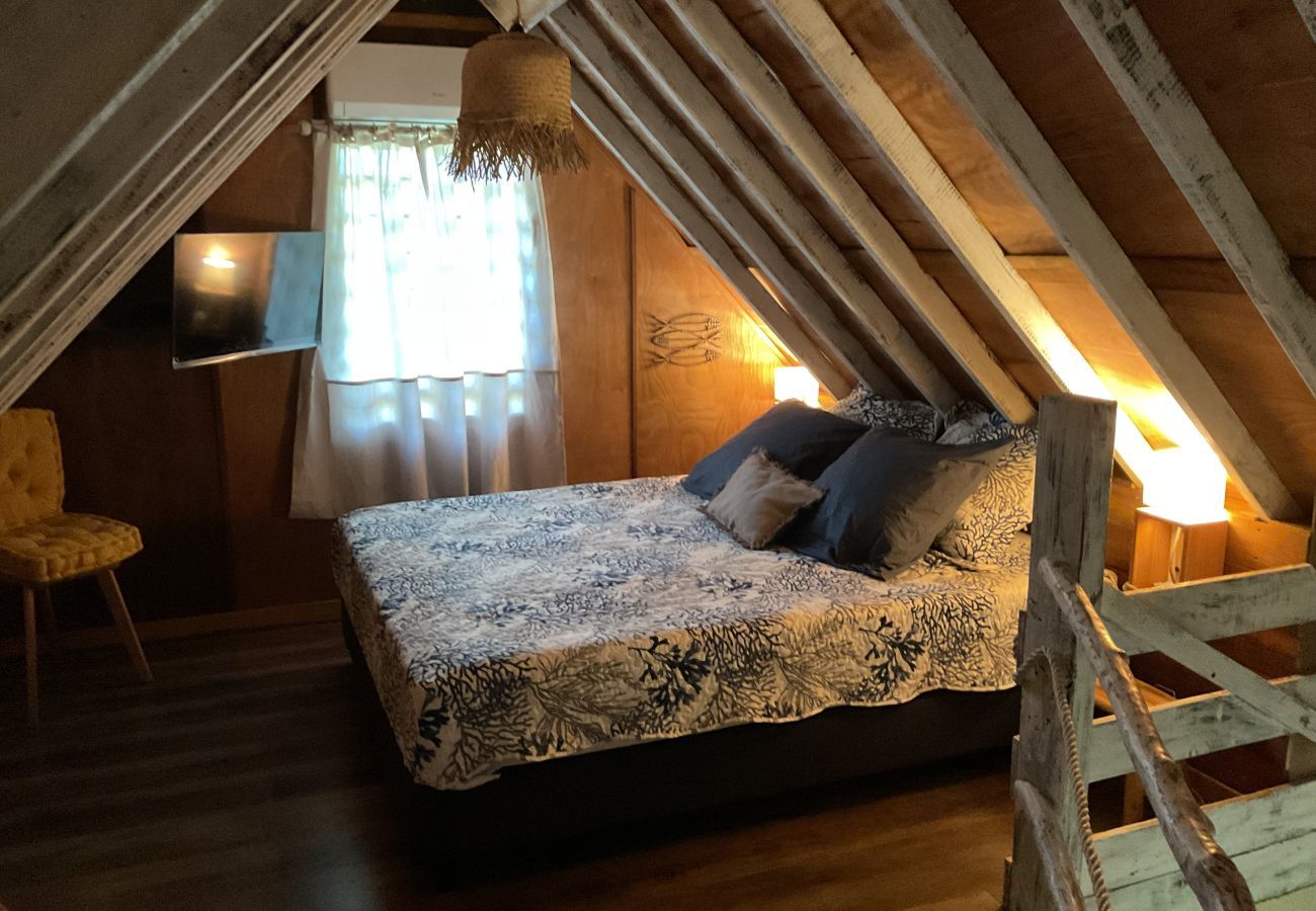 This little paradise is perfect for an unforgettable getaway under the Polynesian latitudes. In your accommodation, you will find a night space in a mezzanine with a queen-size bed, a television and air conditioning for peaceful and restorative nights. The kitchenette is fully equipped, allowing you to prepare and enjoy delicious meals at your convenience.